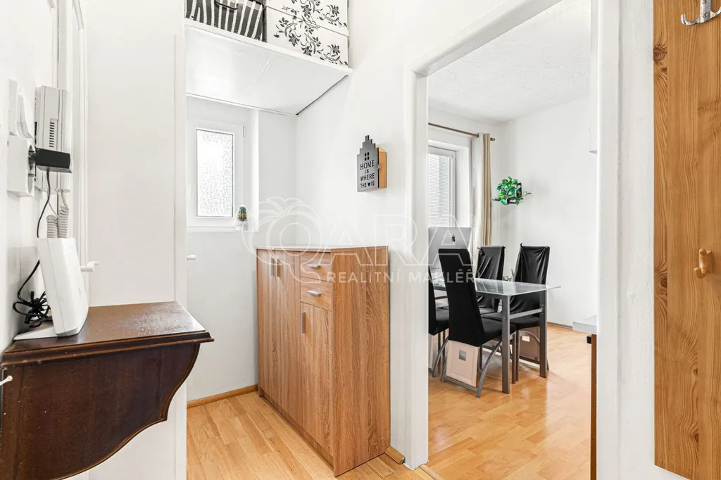 Dispozice 1+1 působí díky otevřenému řešení vzdušně a prakticky, kuchyně má dostatek místa i pro jídelní kout. Všechna okna jsou orientována na východ, což zajišťuje příjemné ranní světlo a klid byt je zcela bez ruchu z ulice.