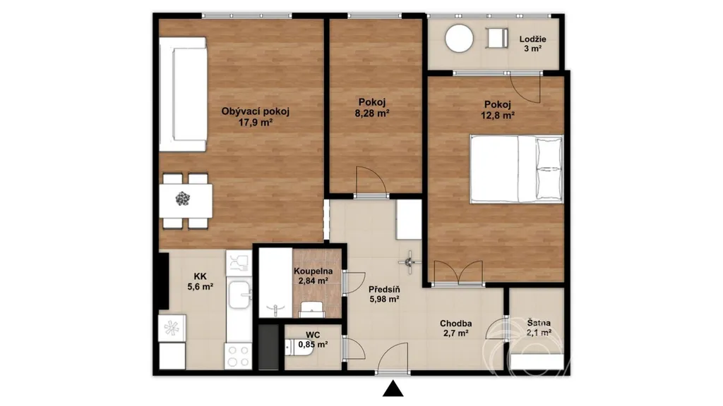 Koupelna je vybavena vanou, umyvadlem a přípojkou na pračku, toaleta je samostatná. Příjemným bonusem je zasklená lodžie s pěkným výhledem, ideální pro odpočinek.