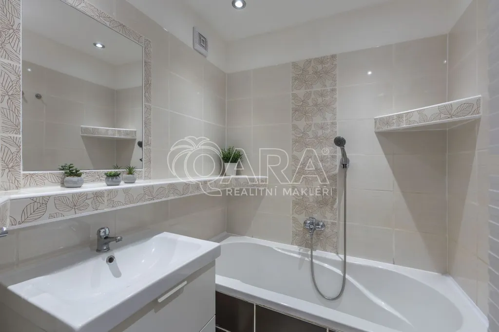 Koupelna disponuje vanou, umyvadlem se skříňkou a topným žebříkem. WC je oddělené, přičemž koupelna i toaleta jsou řešeny v jednotném designu s keramickým obkladem a dlažbou.