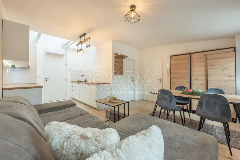 V zastoupení vlastníka vám nabízím k prodeji krásný, plně zařízený byt o dispozici 2+kk a rozloze 48,1 m2. Byt je umístěn ve 2. patře renovovaného bytového domu bez výtahu. Jednotka sama o sobě má příjemnou vzdušnou dispozici, minimalistický čistý design a je prodáván s kompletním vybavením tak, že už si stačí vzít jen kartáček na zuby a můžete zde bydlet. Budoucí obyvatele jistě potěší i fakt, že je v bytě instalována klimatizace, takže letních veder se nemusíte vůbec obávat.