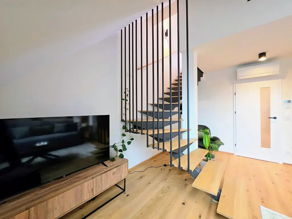 Interiér bytu byl navržen s důrazem na nadčasovou eleganci, kvalitní materiály a maximální komfort. Obytný prostor přirozeně navazuje na terasu, která poskytuje ideální místo pro relaxaci i společenská setkání s výjimečnou atmosférou města pod vámi.