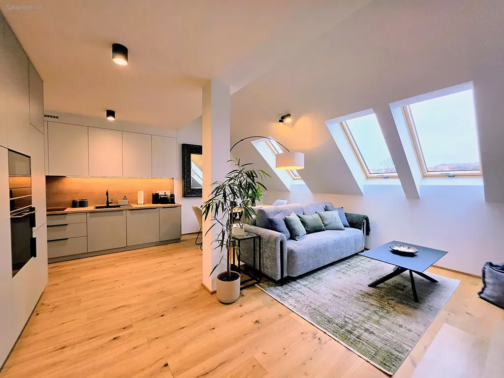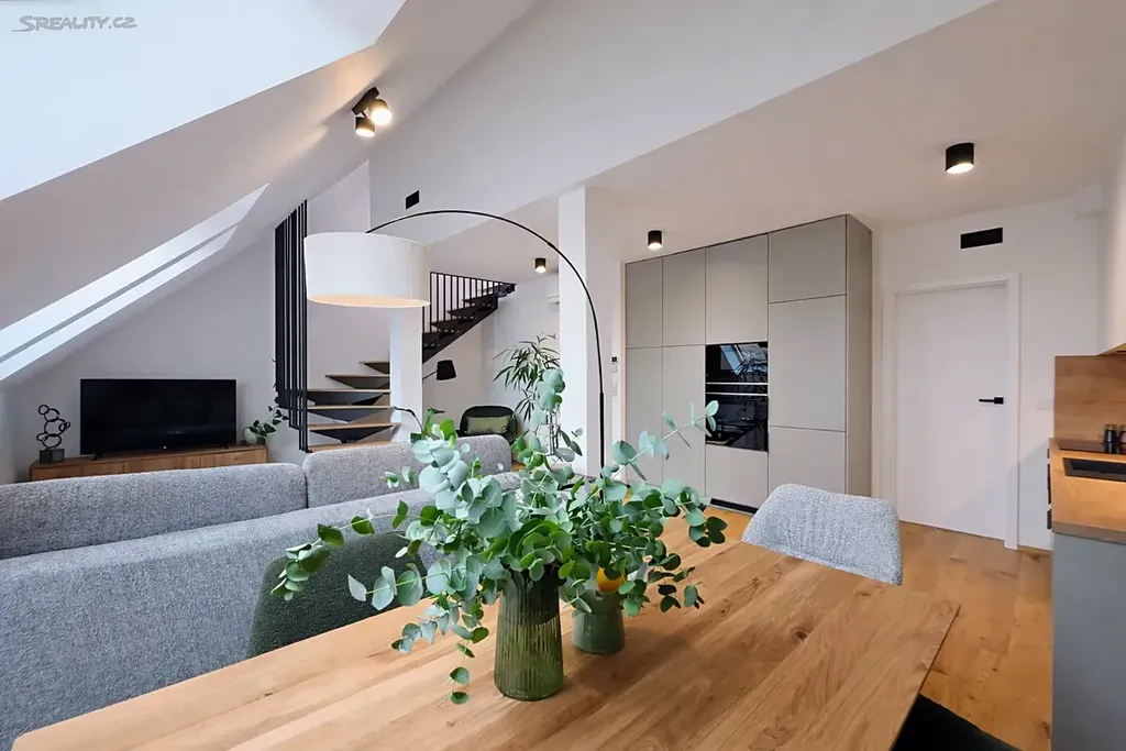 Součástí vybavení bude designová kuchyňská linka na míru s vestavěnými spotřebiči, doplněná pečlivě vybraným nábytkem, který podtrhuje moderní charakter interiéru. Byt bude dále vybaven pračkou a sušičkou, což zajišťuje plný komfort každodenního bydlení.