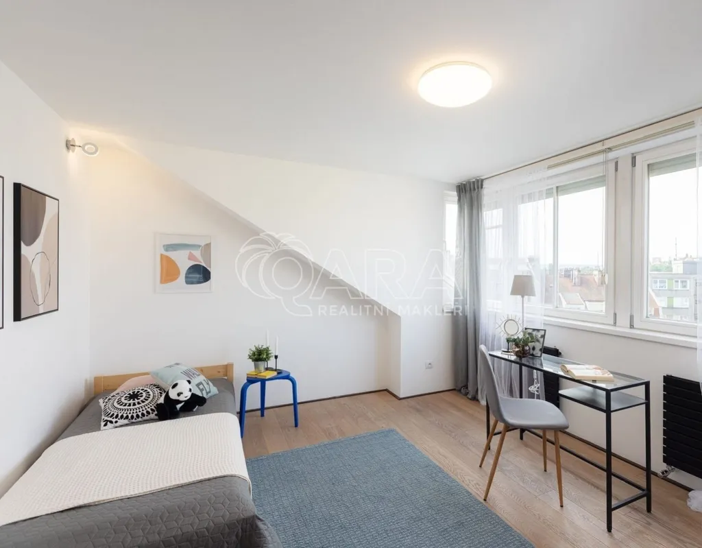 Zapomeňte na stereotypní podkrovní byty s nízkými stropy. Tohle je prostor, kde se můžete nadechnout. Na ploše 146 m se rozkládá byt, který v sobě snoubí moderní design a praktičnost. Díky výtahu, který vás doveze až do vaší předsíně pomocí čipu, si užijete maximální komfort a soukromí. Pro hosty je k dispozici video telefon a schodiště, které můžete využít pro dodatečný úložný prostor.