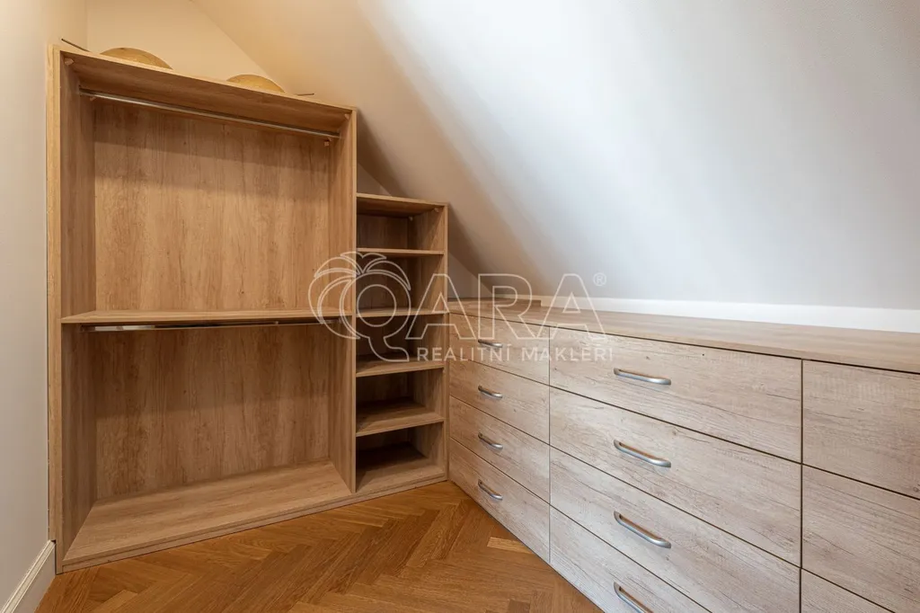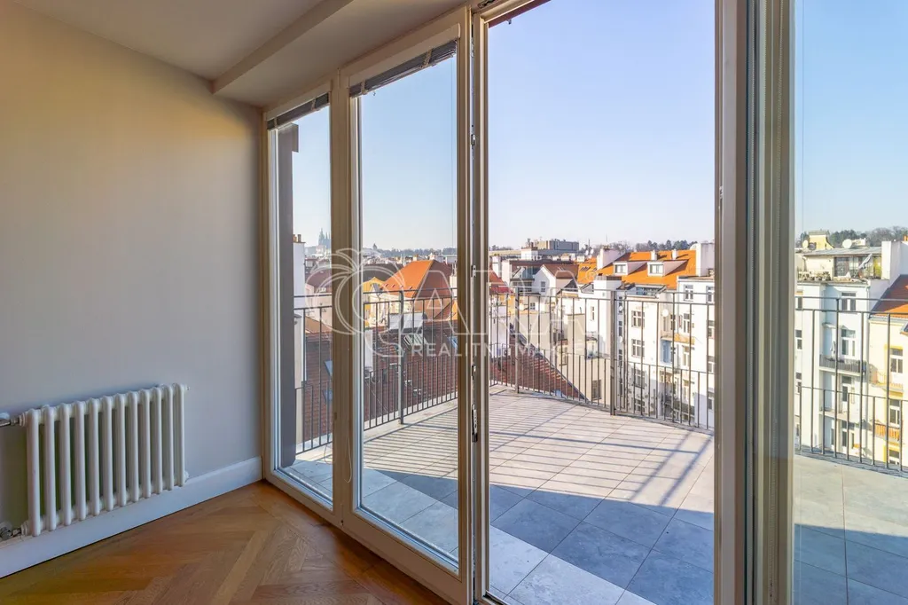 Horní úroveň (podkroví) slouží jako klidová zóna se dvěma ložnicemi a vlastní koupelnou. Ta je nadstandardně vybavena vanou, dvěma umyvadly, bidetem a toaletou, k dispozici je zde i pračka a sušička. Jedna z ložnic disponuje vlastní šatnou, druhá je klimatizovaná a nabízí přímý vstup na terasu (8,9 m) s výhledem na Pražský hrad a střechy Starého Města. Byt má vlastní vytápění zajištěné plynovým kotlem. Na podlahách jsou dubové parkety, vzhledem k jejich údržbě je byt určen pro nájemce bez domácích mazlíčků.