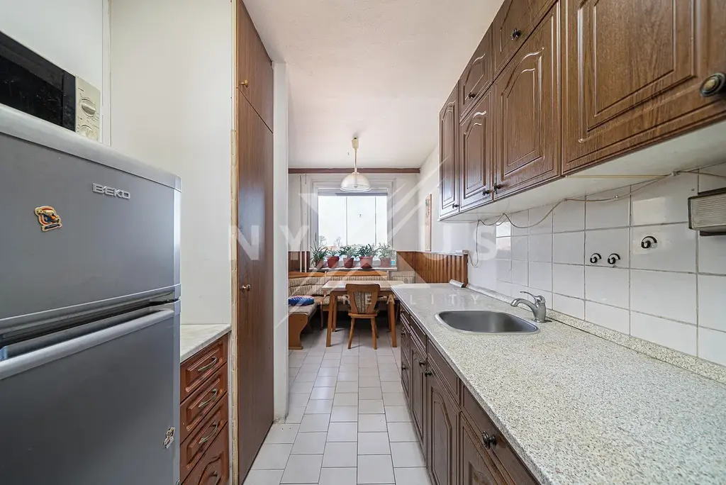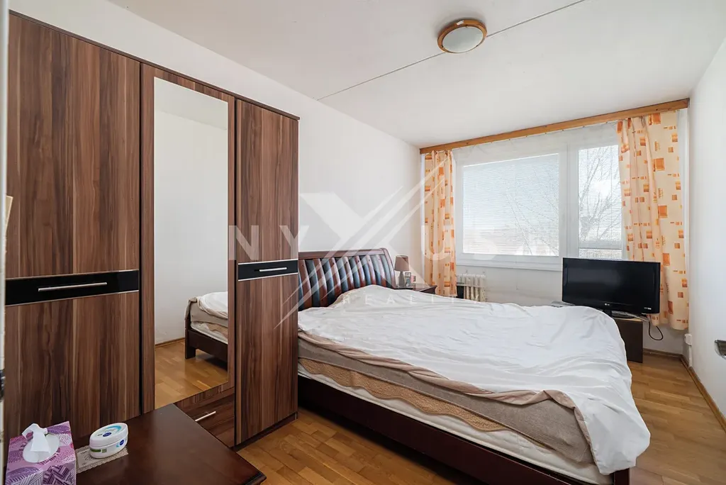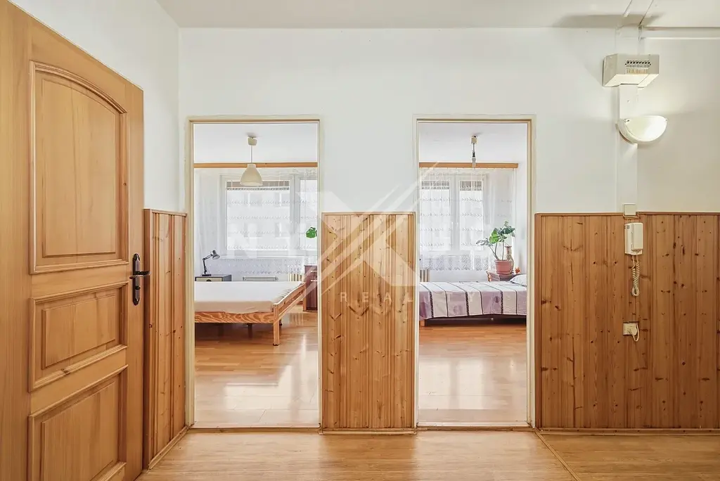 Interiér tohoto bytu nabízí obývací pokoj se vstupem na zasklenou lodžii a krásným výhledem do zeleně, samostatnou kuchyni, a další čtyři pokoje z toho jeden se svým sociálním zařízením ( samostatné WC), velmi prostorné chodby, koupelnu s vanou a další toaletou.