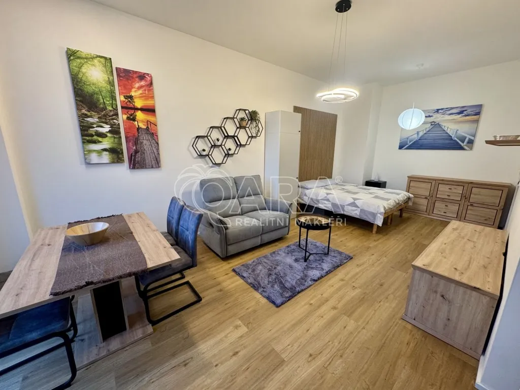 K dlouhodobému pronájmu nabízíme zařízený, prosvětlený byt 1+kk o celkové ploše 42 m s zahradou o velikosti 10 m, umístěný v 1. nadzemním podlaží. Byt je plně zařízen novým nabytkem podle fotografii, hlavni misnost je chytre rozdelena na nekolik zon: jidelnou, obyvaci, loznici. Kuchynsky kout je oddelen, dale pred koupelnou se jeste nachazi technicka mistnost, kde jsou naistalovana pracka, vesak s polickami. V predsine je velka satni skrin.
