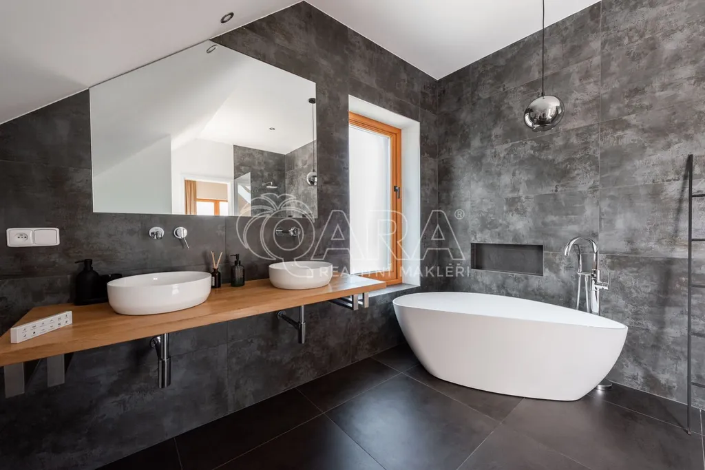 Třípodlažní dům s rozlohou 219 m2, který je charakteristický minimalistickým interiérem a velkými okny, nabízí v přízemí velkorysý obývací pokoj s jídelnou a kuchyň s ostrůvkem. Dále se zde nachází pokoj využitelný například pro relaxaci nyní zařízený jako jídelna. Praktická je technická místnost s přípojkou na pračku a sušičku a toaleta. Z obývacího pokoje je přímý výstup na terasu. V prvním patře, do kterého se vstupuje z ulice, se nachází tři samostatné ložnice a velká koupelna s volně stojící vanou, sprchovým koutem a toaletou. Ve druhém patře je rozlehlý podkrovní pokoj a další koupelna s volně stojící vanou, sprchovým koutem a toaletou. Dále je zde vstup na soukromou terasu se saunou.