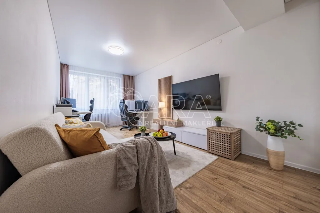 Dispozice zahrnuje prostorný obývací pokoj s výhledem do zeleně, samostatnou ložnici, samostatnou kuchyni s částečně rekonstruovanou kuchyňskou linkou, předsíň s velkými vestavěnými skříněmi, a koupelnu s vanou a umyvadlem, dále samostatnou toaletu. V bytě jsou vestavěné skříně, nové podlahy v obývacím pokoji a ložnici, vinylová podlaha v kuchyni a předsíni, protihluková stěna v obývacím pokoji a nové podhledy. Částečně jsou také nové rozvody elektřiny. Koupelna a toaleta jsou vybaveny dlažbou a obklady.