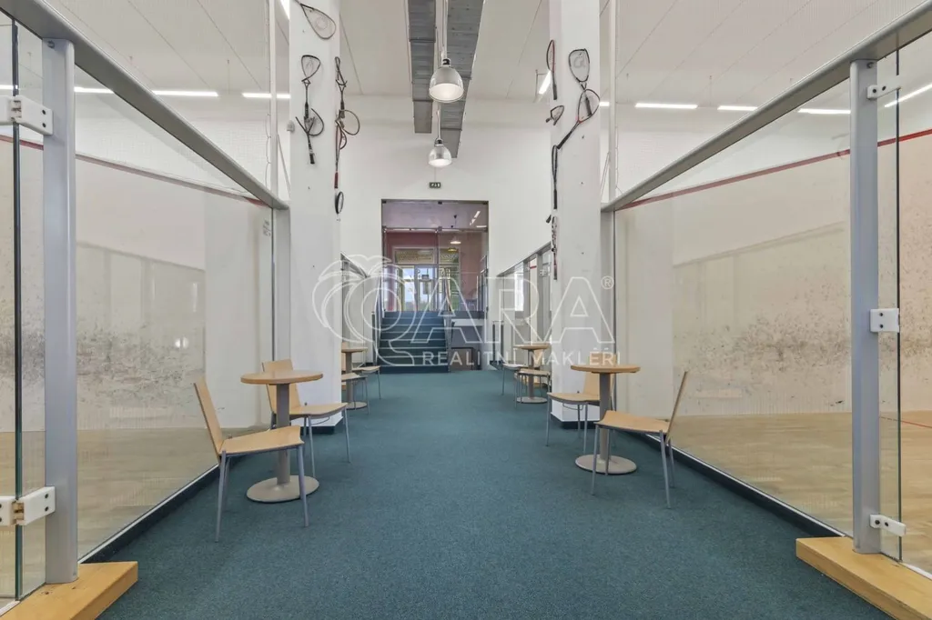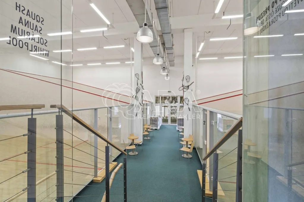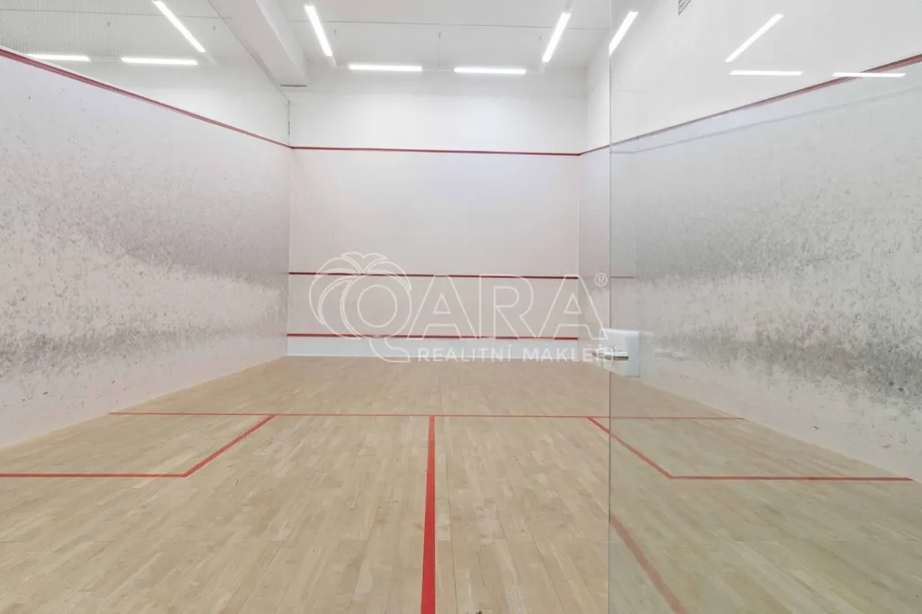 Přízemí (1. NP 541m2: Sportovní srdce objektu 4 squashové kurty s výškou přes dvě podlaží.Prostory pro posilovnu.Reprezentativní recepce se zázemím a barem.Šatny a sprchy pro sportovce.