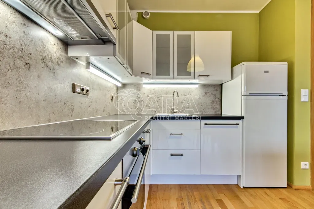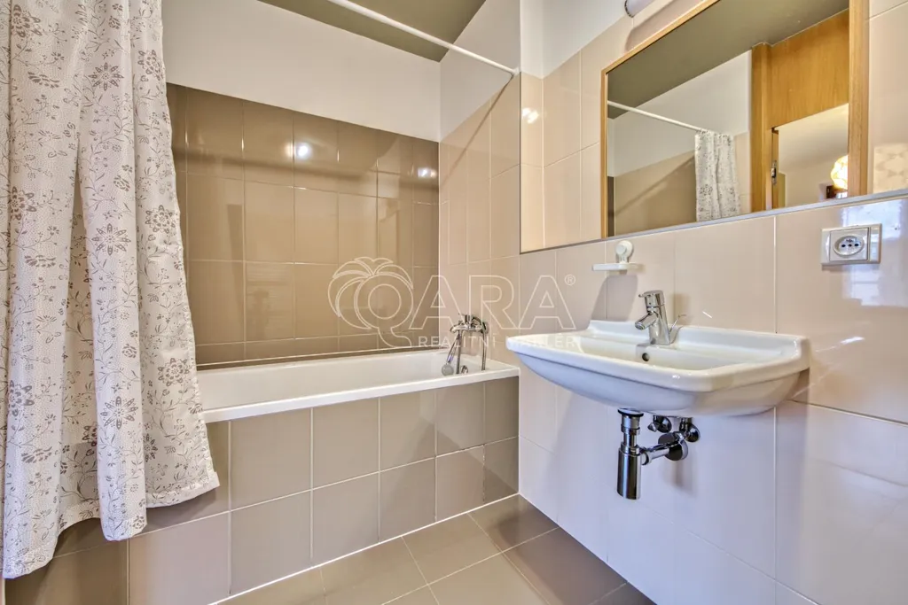 Dominantou bytu je prostorný obývací pokoj s kuchyňským koutem a velkými okny, která zajišťují dostatek denního světla po celý den. Kuchyňská linka je plně vybavena spotřebiči a plynule navazuje na jídelní a obytnou část.
