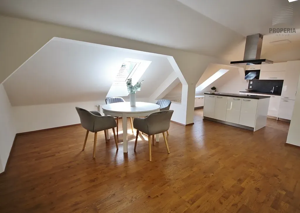 Dominantou bytu je velkorysý obývací prostor s jídelnou a kuchyňskou částí, který je díky své velikosti a orientaci krásně světlý. Přímý vstup na prostornou lodžii vytváří ideální místo pro ranní kávu i večerní posezení. Kuchyňská linka s kuchyňským ostrůvkem je vybavena kvalitními vestavěnými spotřebiči Siemens a nabízí dostatek pracovní i úložné plochy.