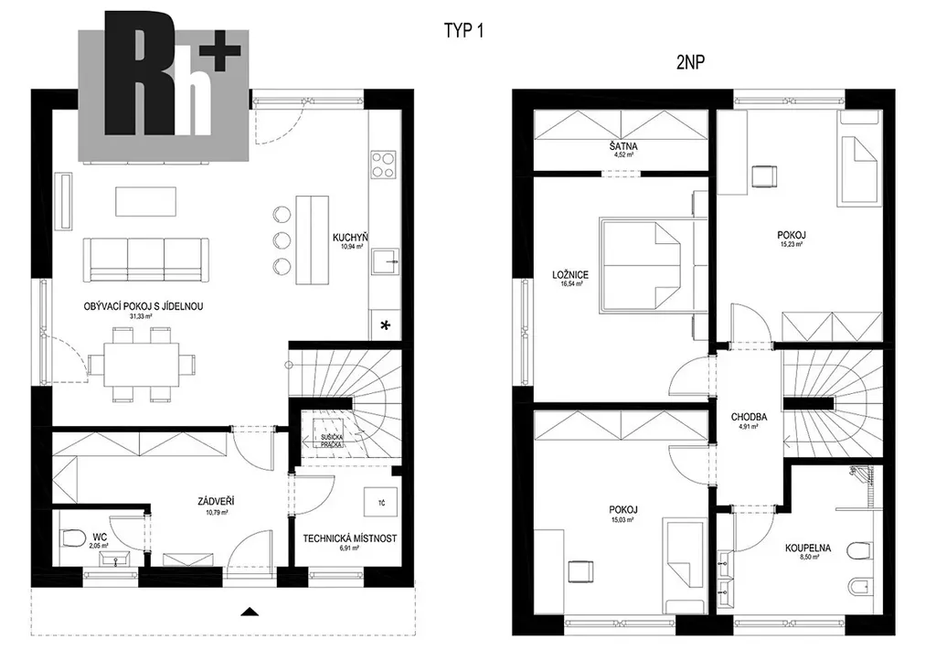 Velmi praktické dispoziční řešení přízemí domu nabízí jedinečný velkorysý prostor spojující obývací část s jídelnou a kuchyní, ze které můžete skrze francouzská okna vstoupit na zastřešenou terasu velkou cca 30 m2. Otevřené řešení tak vytváří uvolněnou vzdušnou atmosféru, luxus soukromí a relaxu.
