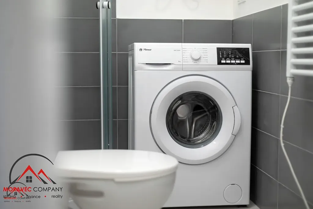 Vybavení bytu zahrnuje kuchyň s elektrickou troubou, indukční varnou deskou, digestoří, mikrovlnkou a zabudovanou lednicí. Koupelna je vybavena sprchovým koutem, pračkou a WC. Ohřev vody zajišťuje elektrický bojler.