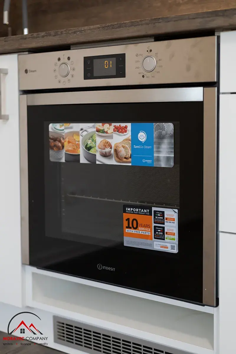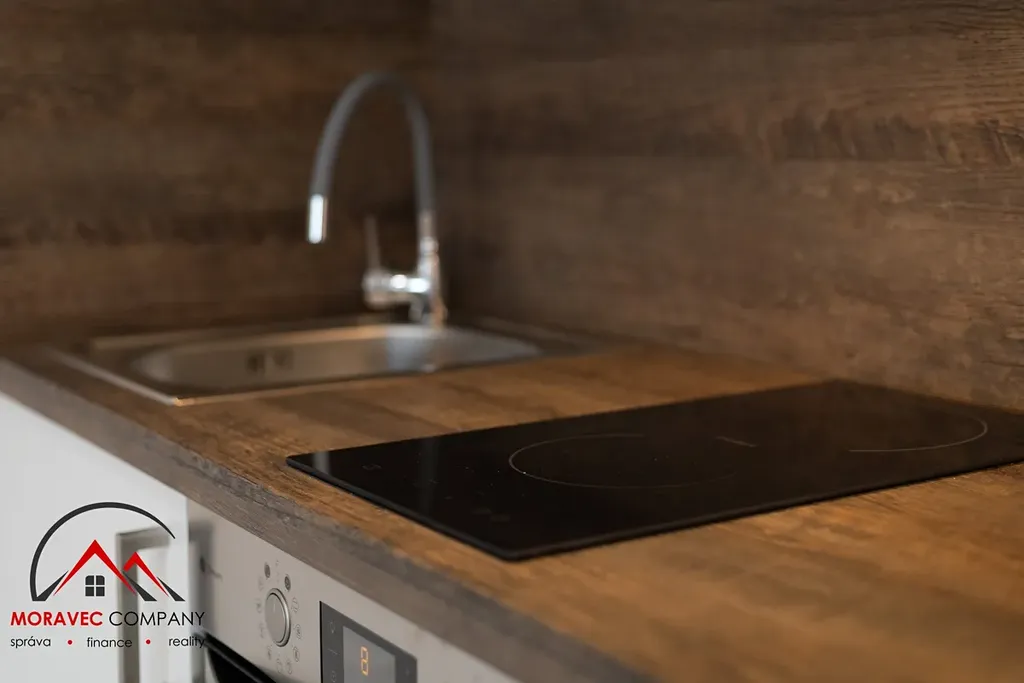 Vybavení bytu zahrnuje kuchyň s elektrickou troubou, indukční varnou deskou a digestoří, koupelna je vybavena sprchovým koutem, zrcadlovou skříňkou na hygienické potřeby a WC. Ohřev vody zajišťuje elektrický bojler.