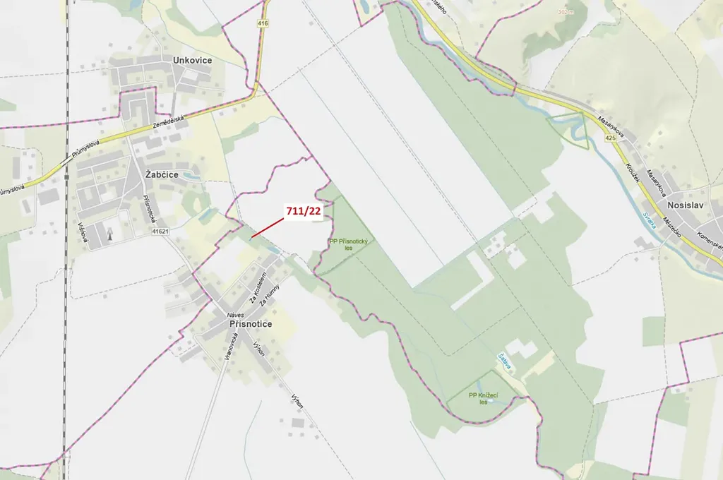 Lesní pozemek o výměře 89 m2, parcelní číslo 711/22, podíl 1/1, katastrální území Přísnotice, obec Přísnotice, obec s rozšířenou působností Židlochovice, okres Brno-venkov, Jihomoravský kraj.