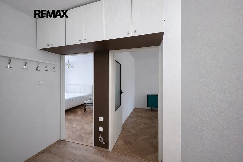 Dispozice bytu je prakticky řešena – z centrální chodby s úložnými prostory se vstupuje do jednotlivých částí bytu. K dispozici je samostatné WC, koupelna, spíž a kuchyň s jídelním koutem. Na kuchyň navazuje jeden velký průchozí pokoj, dále pak samostatný pokoj s přístupem na balkon.