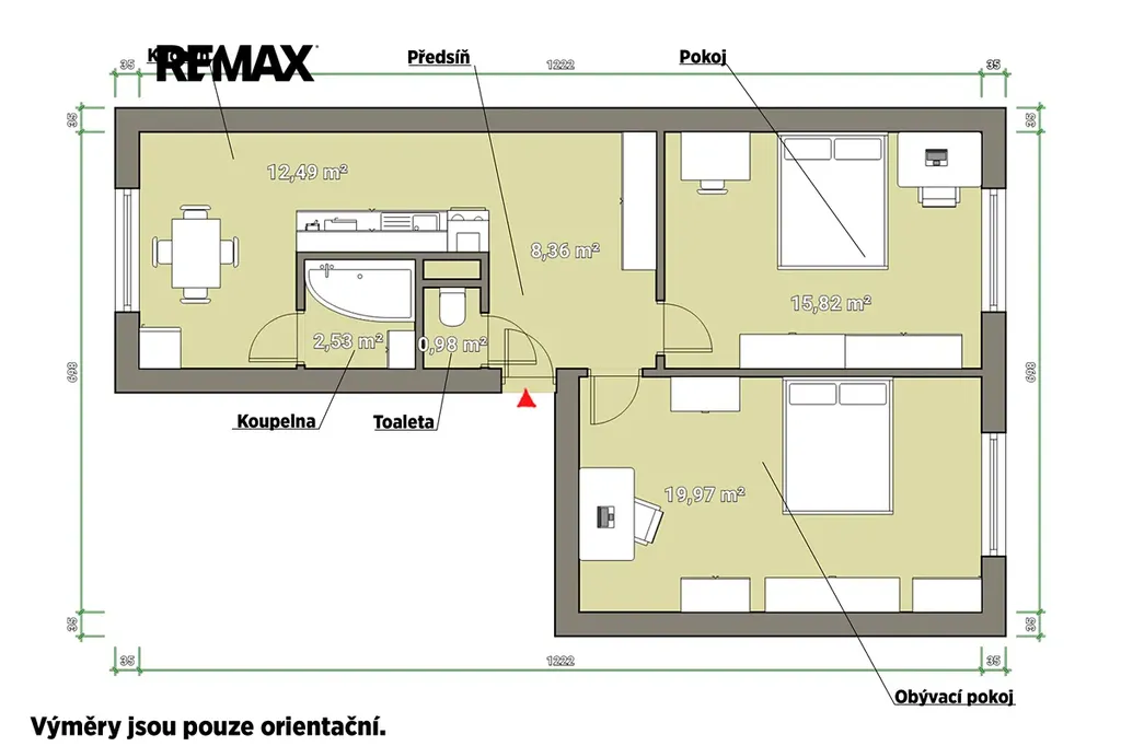 Dispozice bytu je velmi praktická – z centrální předsíně je vstup do všech místností. Byt tvoří obývací pokoj, ložnice a samostatná kuchyň s prostorem pro jídelní kout. Koupelna a toaleta jsou oddělené, což zvyšuje komfort bydlení. Výhodou jsou také neprůchozí pokoje a dobré prostorové uspořádání.