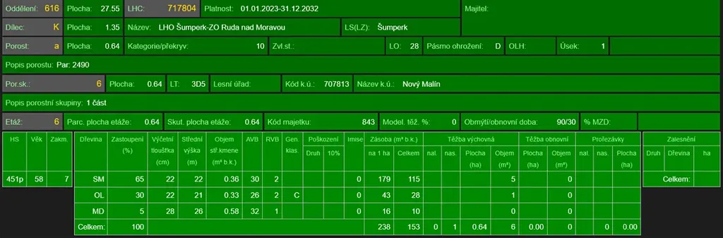 - p.č. 2490 vedená jako lesní pozemek o celkové výměře 6 437 m2 (stáří lesa 61 let - zastoupení dřevin smrk, olše, modřín),