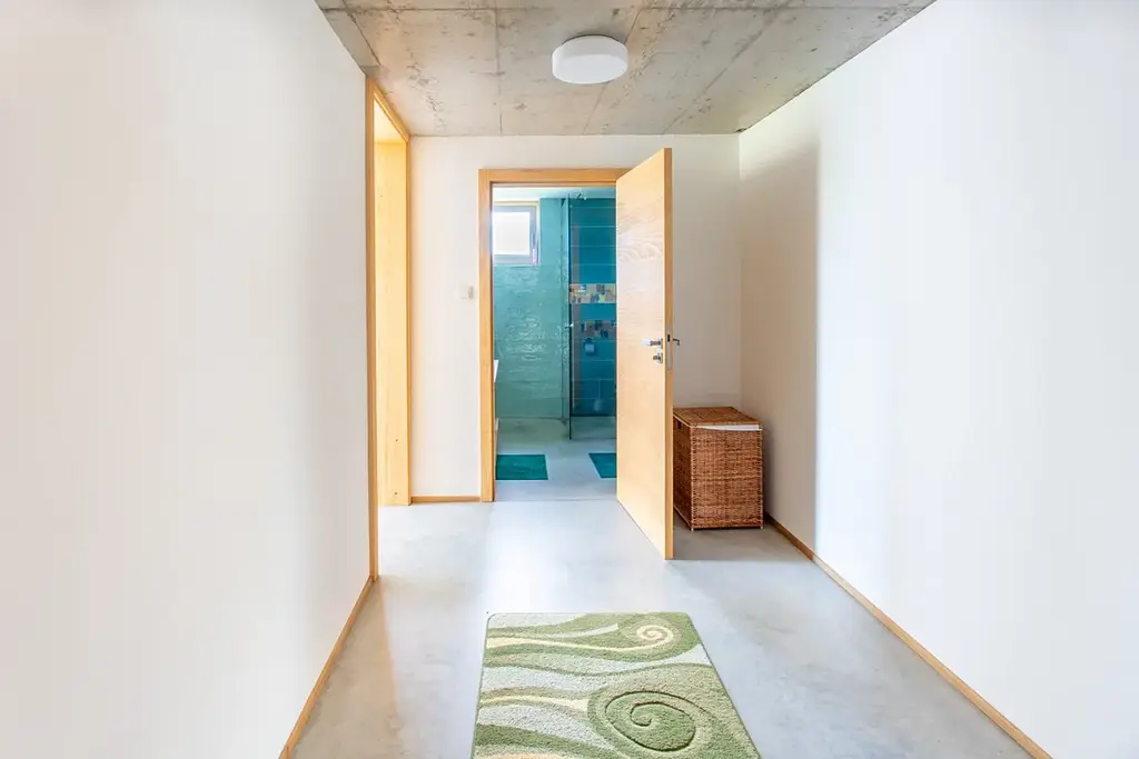 Dům má celkovou plochu 154 m² s dispozicí 3+kk. V přízemí najdete obývací pokoj s propojenou kuchyní a jídelnou, ložnici, koupelnu, 2x WC, technickou místnost a chodbu. První patro nabízí pracovnu a další pokoj. Toto bydlení je vybaveno podlahovým topením s tepelným čerpadlem vzduch-voda a rekuperací, což zaručuje efektivní a ekonomické vytápění. Pro zimní večery si můžete užívat tepla krbu.