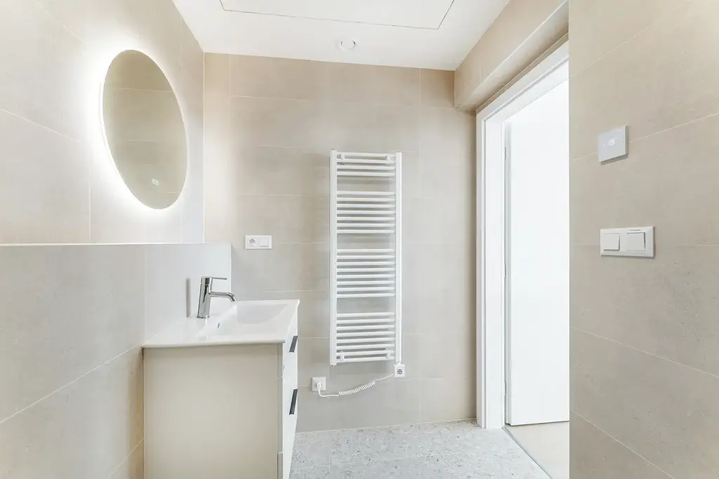 Byt je vybaven moderními technologiemi a nadstandardním standardem: klimatizace, rekuperace, podlahové vytápění Larx, sanita Laufen, zařizovací předměty Jika, vinylové podlahy, obklady Rako v moderním betonovém designu, plastová okna s trojsklem. Ohřev vody je řešen elektrickým bojlerem. K jednotce náleží sklepní kóje.