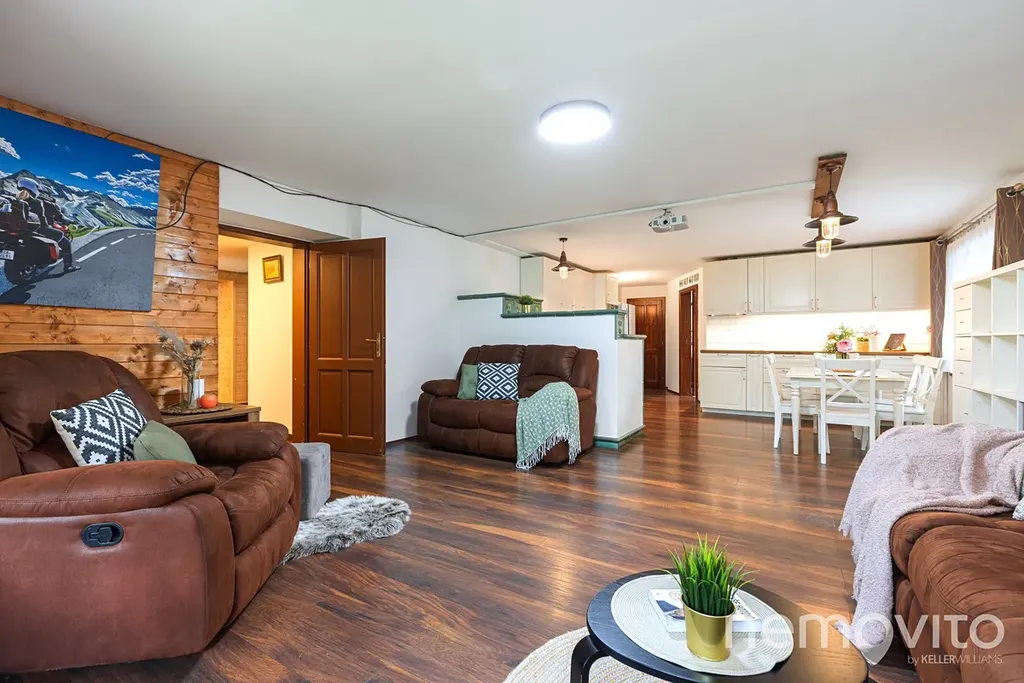 Obytnou část aktuální tvoří dispozice 3+kk. Obývák o velikosti 38 m2 nabízí dost místa pro skutečně velkou linku a jídelnu. Vytápět nemusíte jen v kachlových kamnech, je tu také teplovodní podlahové topení nebo vytápění čerpadlem vzduch-vzduch. Za kuchyní je k dispozici ložnice a velká koupelna, ve které je sauna. Ochladit se pak můžete v bazénu, který je na nejvyšší terase pozemku s výhledem na pivovar. Další ložnice je pak na druhé straně domu, kde je také prádelna, velká vstupní chodba s místem pro šatnu a ještě jeden pokoj (s pískovcovou zdí), přes který je přístup také do penzionu.