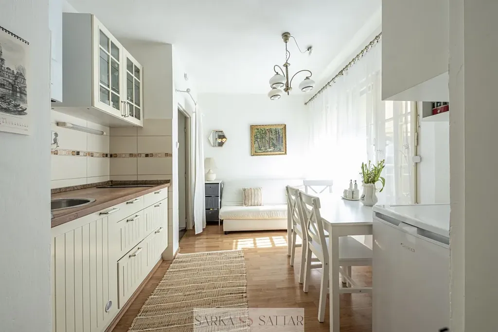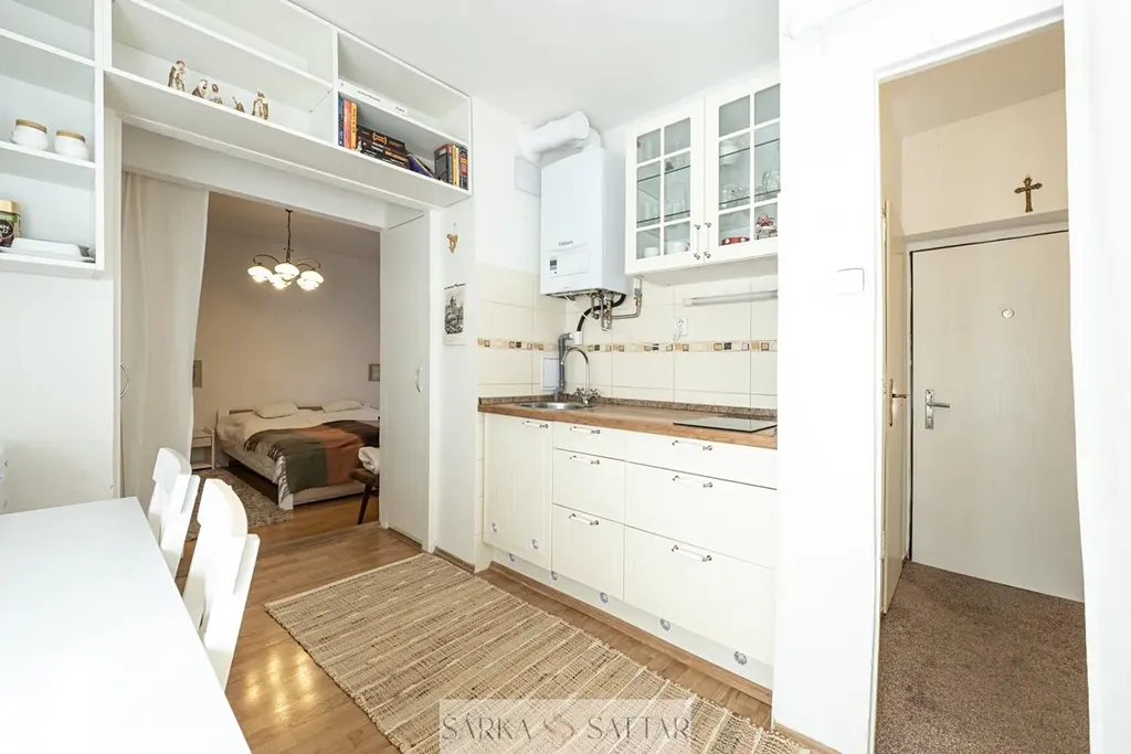 Tento prakticky zařízený byt dle fotografií, nabízí kuchyň s el.varnou deskou, lednici, úložné prostory, dále ložnici, koupelnu se sprchovým koutem, umyvadlem a toaletou a přívodem na pračku, chodbu se skříní a botníkem. Ohřev vody kotlem, topení wav.