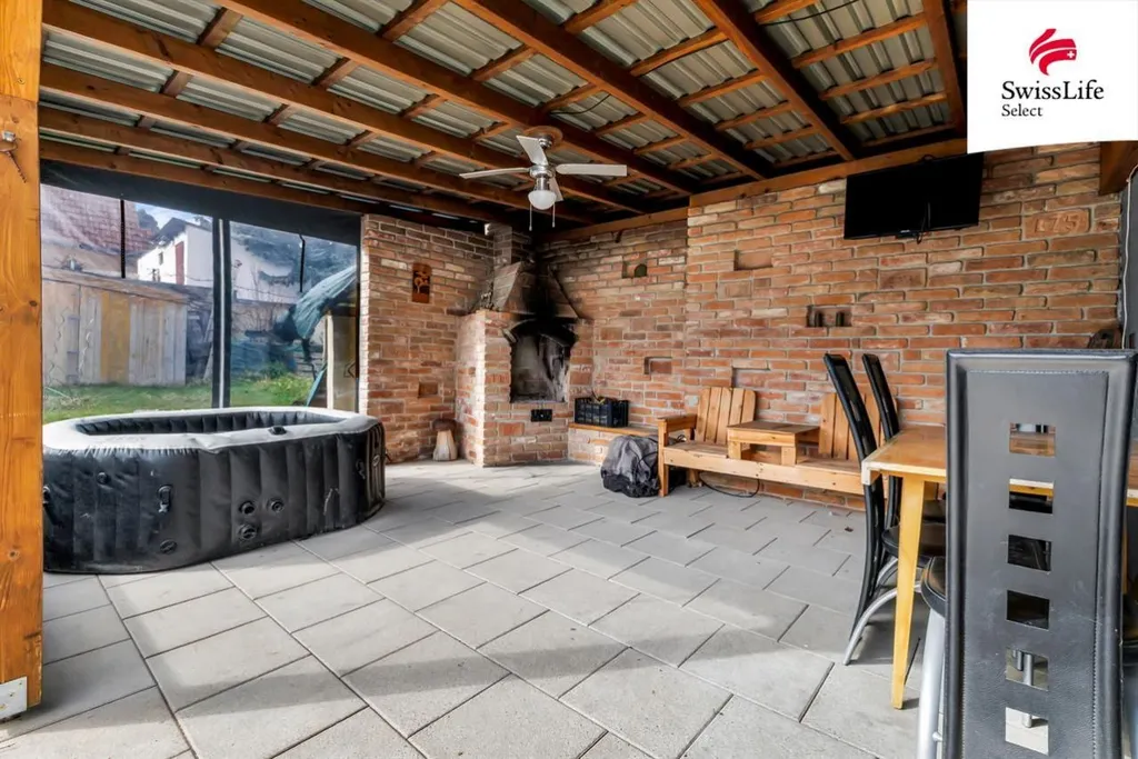 Pokud zatoužíte po čerstvém vzduchu, přesunete se na terasu. Večer se za jakéhokoli počasí můžete schovat pod krytou pergolou, kde je venkovní krb, vířivka a posezení. Ale to není všechno. Naleznete tu i prostornou dílnu pro kutily, venkovní kuchyň a dokonce i sklep, který by mohl posloužit nejen jako sladovací prostor, ale klidně jako menší domácí wellnes se saunou.