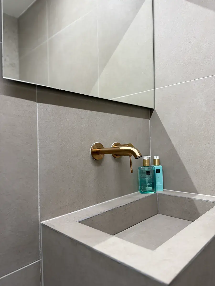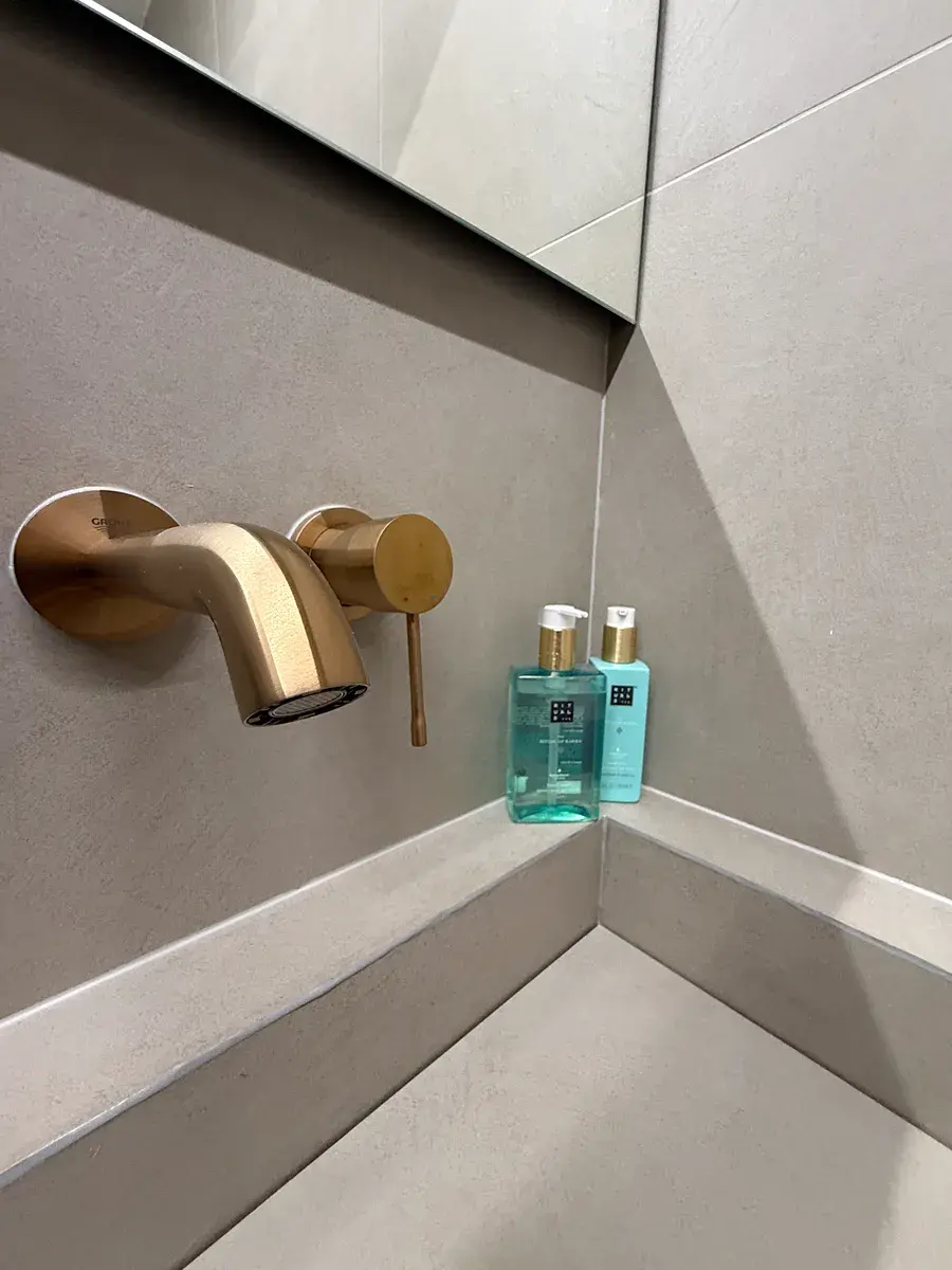 • Unikátní koupelna: Volně stojící vana, umyvadlo i ovládání WC vyrobené na míru z obkladu. Kamenické rohy. Veškeré baterie jsou značky Grohe.