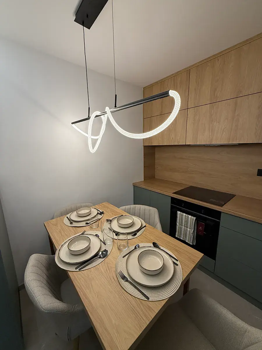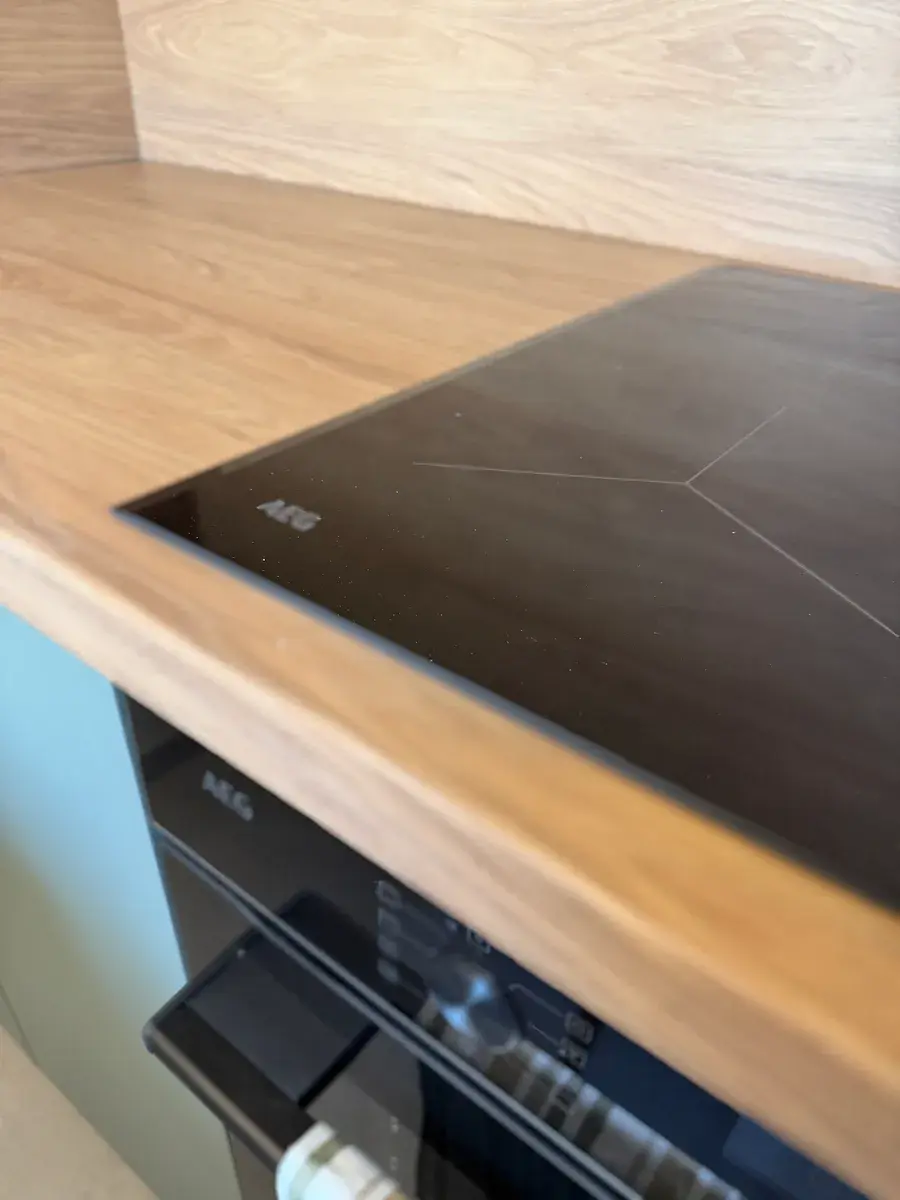 • Kuchyně: Designová linka se špičkovými spotřebiči AEG (indukce, trouba, myčka, digestoř, vestavná lednice) a jídelní stůl včetně židlí. Stačí jen něco uvařit a můžete ke stolu.