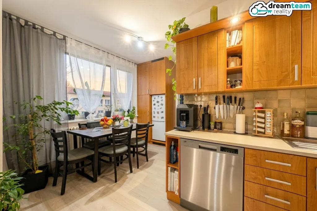 Propojená kuchyně, jídelna a obývací pokoj — tohle řešení mně osobně připomíná rodinný dům, jen bez sekání trávníku. Vaříte, jíte a zároveň sledujete, co dělají děti v obývacím pokoji. Do obýváku vedou dveře z chodby i z kuchyně, takže si dispozici přizpůsobíte přesně sobě. A kuchyně? Moderní linka s myčkou nádobí na palubě. Haló, konec mytí nádobí! A díky prostorné jídelně i konec drobků v obýváku. Spižírna hned vedle lednice je jako bonus.