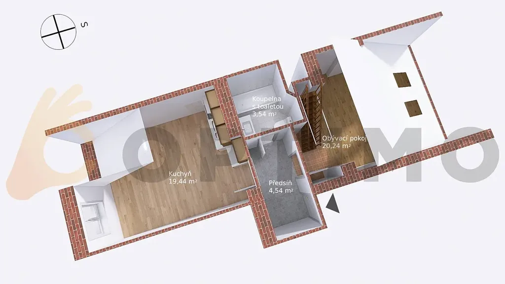 Obývací pokoj 20,24 m2 se schody do patra 17,95 m2