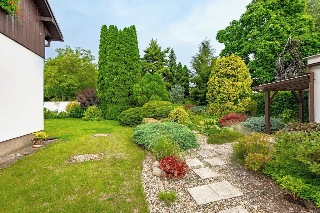 U domu se rozkládá nádherná, pečlivě udržovaná zahrada se zakrytým posezením u rybníčku, kde plavou barevné rybky, přinášející klid a harmonii. Okrasné stromy, keře a květiny dotvářejí malebný ráj, který zve k odpočinku a chvílím pohody.