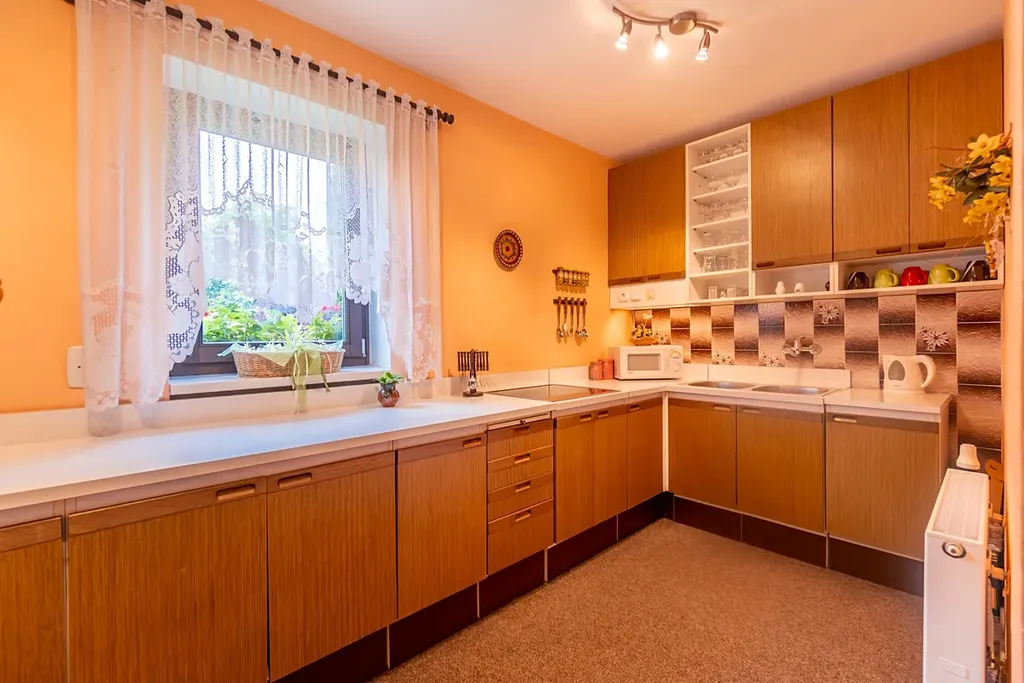 V přízemí vás přivítá světlý obývací pokoj s pohodovým vstupem na terasu – ideální místo pro rodinné setkání či odpočinek s knihou či šálkem čaje. Kuchyně s kuchyňskou linkou do tvaru L , s oknem do zahrady, které vám umožní sledovat krásu okolí při vaření nebo relaxaci.