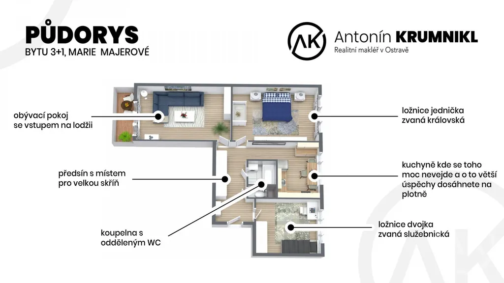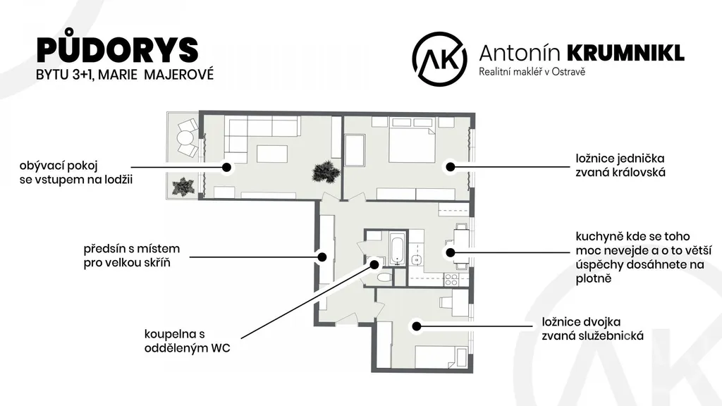 Tahle třiplusjednička má tři pokoje, ani jeden z nich není nepoužitelná nudle a taky lodžii, kde se buď v létě vyplácneš nebo tam vyvěsíš v létě prádlo, protože sušáky jsou hnusné.