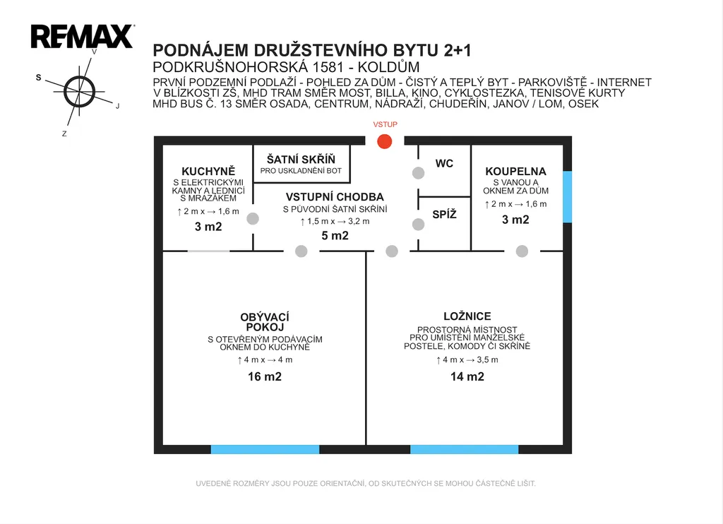 V přímé blízkosti domu je autobusová zastávka linky č. 13 směr Lom-Loučná-Osek / Billa-centrum-nádraží-Chudeřín-Janov. Dále je v přímé blízkosti sportovní hala, oblíbené koupaliště (nyní v rekonstrukci), potraviny (večerka), základní škola, nedaleko pak Billa, pošta, kino či konečná tramvaje. Před domem je veliké parkoviště a za domem různé atrakce nejen pro ty nejmenší - prolézačky, houpačky, skluzavky, pískoviště, ale také třeba workoutové hřiště či oblíbená cyklostezka.