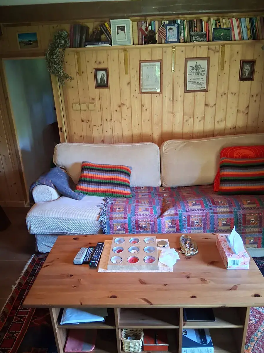 Malá kompletně vybavená kuchyň, obývací pokoj a místnost s umyvadlem a přenosným WC.