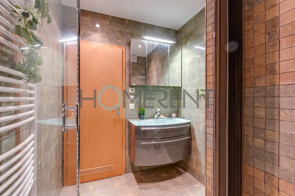 Součástí bytu je plně vybavená kuchyňská linka s lednicí, mrazákem, myčkou nádobí, varnou deskou a dalšími spotřebiči potřebnými pro pohodlné každodenní fungování domácnosti. K dispozici je také kombinovaná pračka se sušičkou. Velkým benefitem interiéru je i vestavěná vinotéka a krb, které dodávají bytu osobitý charakter a příjemnou atmosféru.