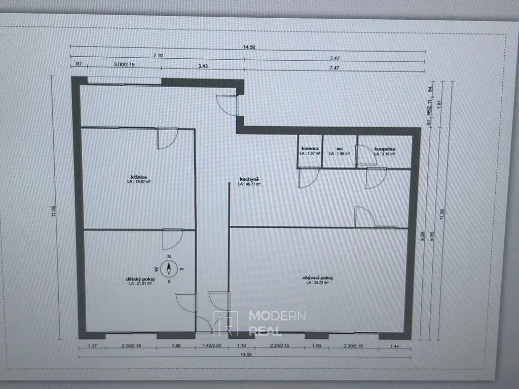 - Pravé křídlo: prostorný obývací pokoj (34 m²) propojený s kuchyní (24 m²), koupelna (6 m²), komora (2 m²)