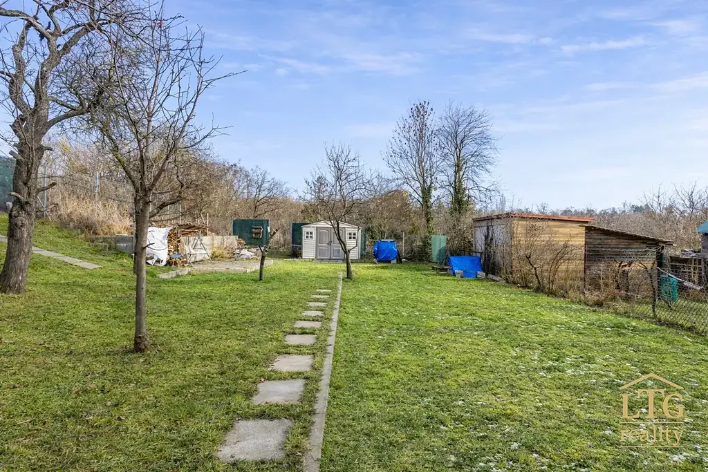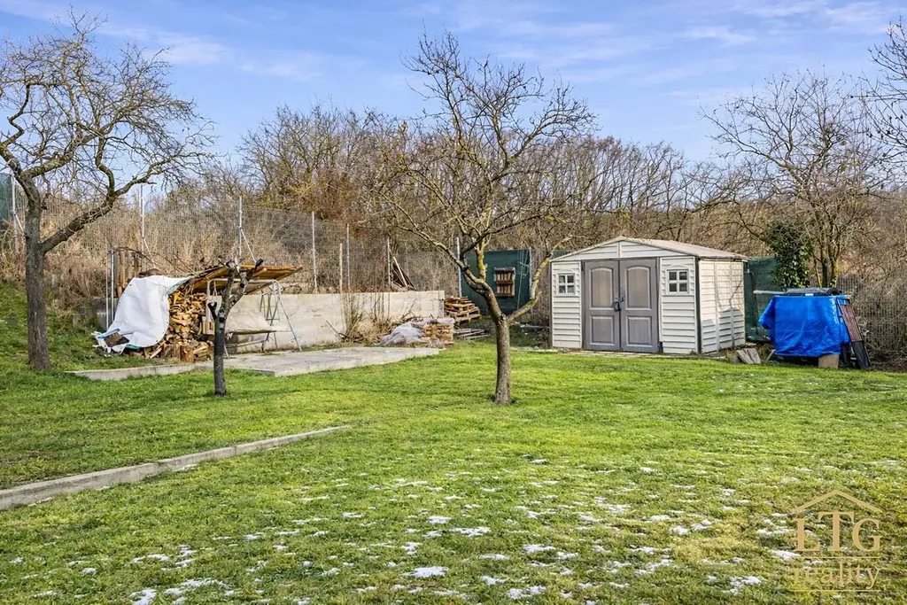 Pozemek je oplocený po celém obvodu. Už nyní je zde připravené zázemí pro běžné fungování – dlážděná plocha vhodná pro posezení či pergolu a zahradní domek pro uložení vybavení. Není potřeba řešit základní úpravy, zahrada je využitelná ihned.