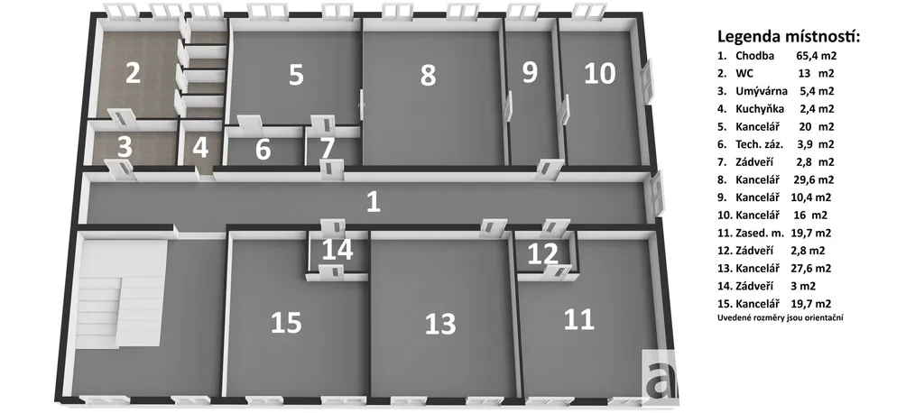 Dispozice: 6 samostatných kanceláří + zasedací místnost (ideální pro management, obchod i administrativu).