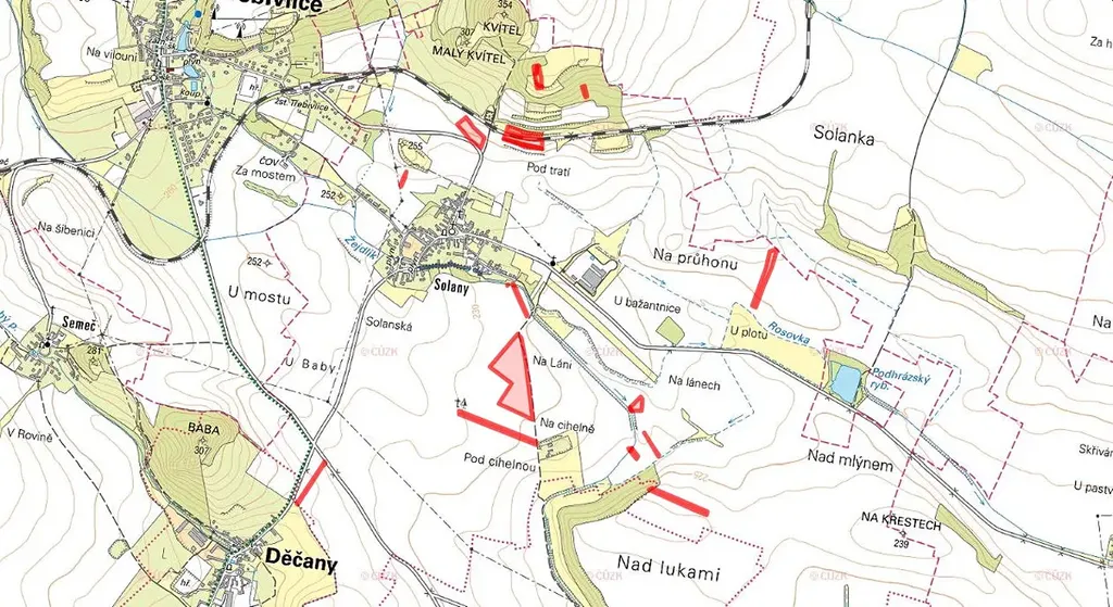 V katastrálním území Solany, obec Děčany, okres Litoměřice, nabízíme k prodeji rozsáhlý komplex pozemků ve výlučném vlastnictví o celkové výměře 78 982 m². Pozemky jsou zapsány na listu vlastnictví č. 59.