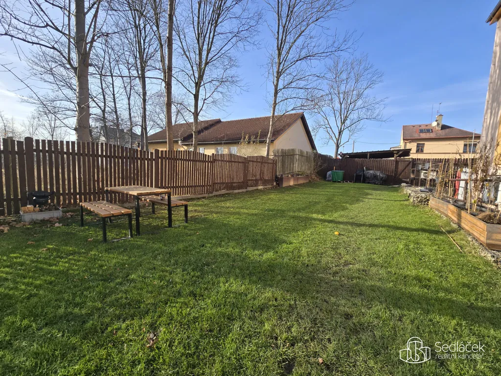 Zahrada domu je oplocena a je k dispozici všem nájemníkům celkem sedmi bytových jednotek. Jedná se o klidné a moderní bydlení.