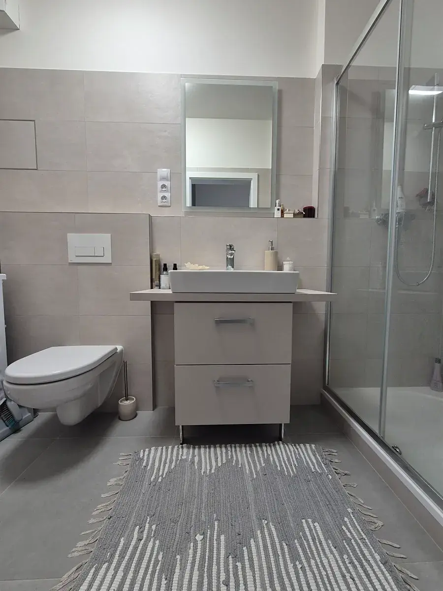 Koupelna: Sprchový kout, umyvadlo se skříňkou, pračka a toaleta.