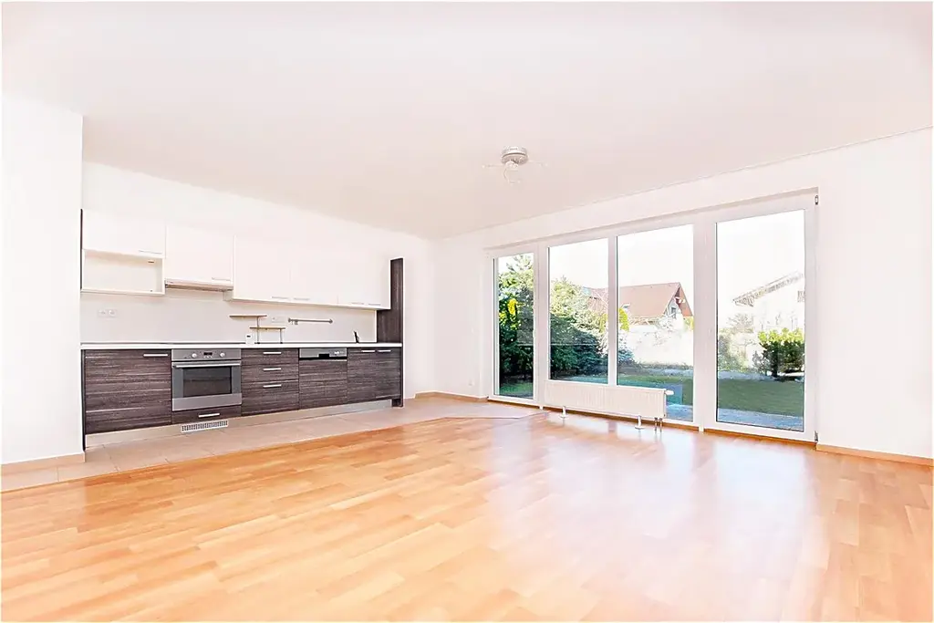 V přízemí se nachází předsíň s chodbou, samostatný pokoj, obývací pokoj s kuchyňským koutem a koupelna s vanou a WC (včetně přípravy pro pračku). Kuchyňská linka je vybavena vestavnými spotřebiči trouba, sklokeramická varná deska, myčka, mikrovlnná trouba a digestoř.