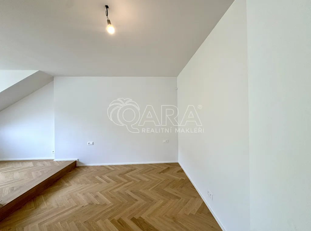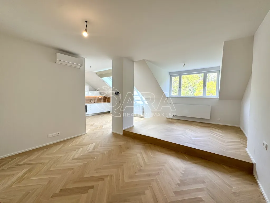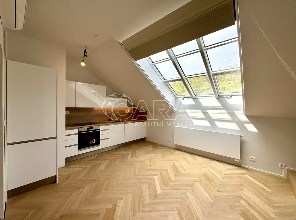 Tento světlý, vzdušný byt (56 m2) se nachází ve V. nadzemním podlaží domu bez výtahu, ale tato drobná nevýhoda je vyvážena jeho skvělou polohou a příjemným prostředím. Jednotka disponuje také klimatizací. Dispozice bytu je velmi praktická a prostorná. Vstupní místnost s vestavnými skříněmi nabízí dostatek úložného prostoru. Velká obytná místnost slouží jako ložnice a zároveň jako obývací pokoj, ve kterém se nachází moderní a plně vybavená kuchyňská linka. Ta obsahuje lednici, mrazák, sporák, troubu, myčku a digestoř. Samozřejmostí je i koupelna se sprchovým koutem, umyvadlem, toaletou a přípojkou na pračku se sušičkou. Z bytu je naprosto nádherný výhled do zahrady Kinských. K jednotce je možné pronajmout parkovací stání ve dvoře.