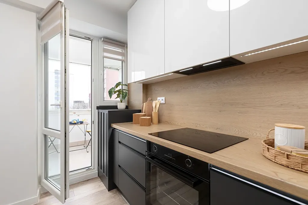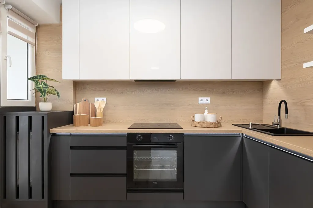 V kuchyni je nová rohová kuchyňská linka na míru v kombinaci antracitu a bílé barvy s vestavěnými spotřebiči lednice s mrazákem, horkovzdušná trouba, indukční varná deska, myčka, digestoř.