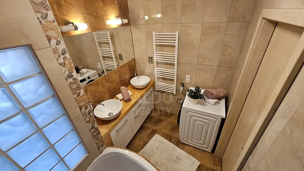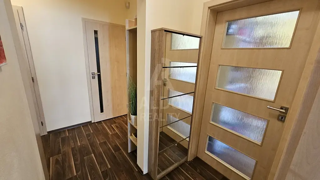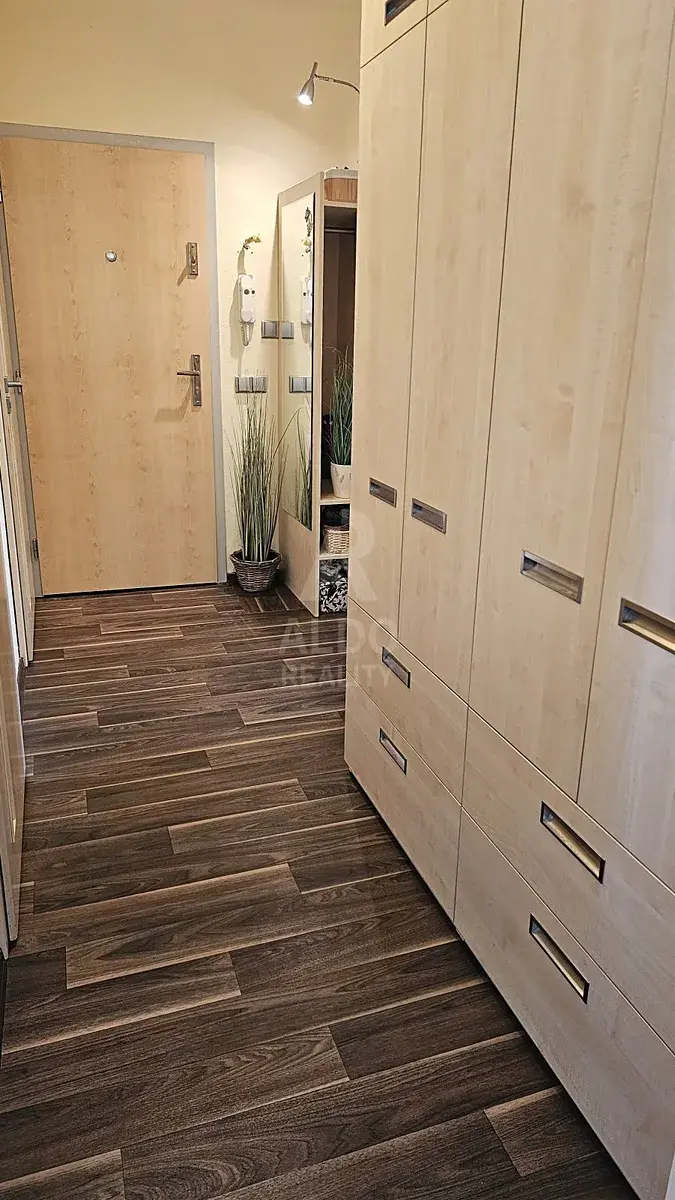 Interiér je ve velmi dobrém stavu, bez dalších nutných investic. Součástí je kuchyňská linka včetně spotřebičů, koupelna s rohovou vanou, vestavná skříň v předsíni, v ložnici a nové podlahy vinylové podlahy v celém bytě. Interiér působí elegantně a nadčasově. K bytu náleží dvě sklepní kóje, jedna na patře, druhá v přízemí domu.
