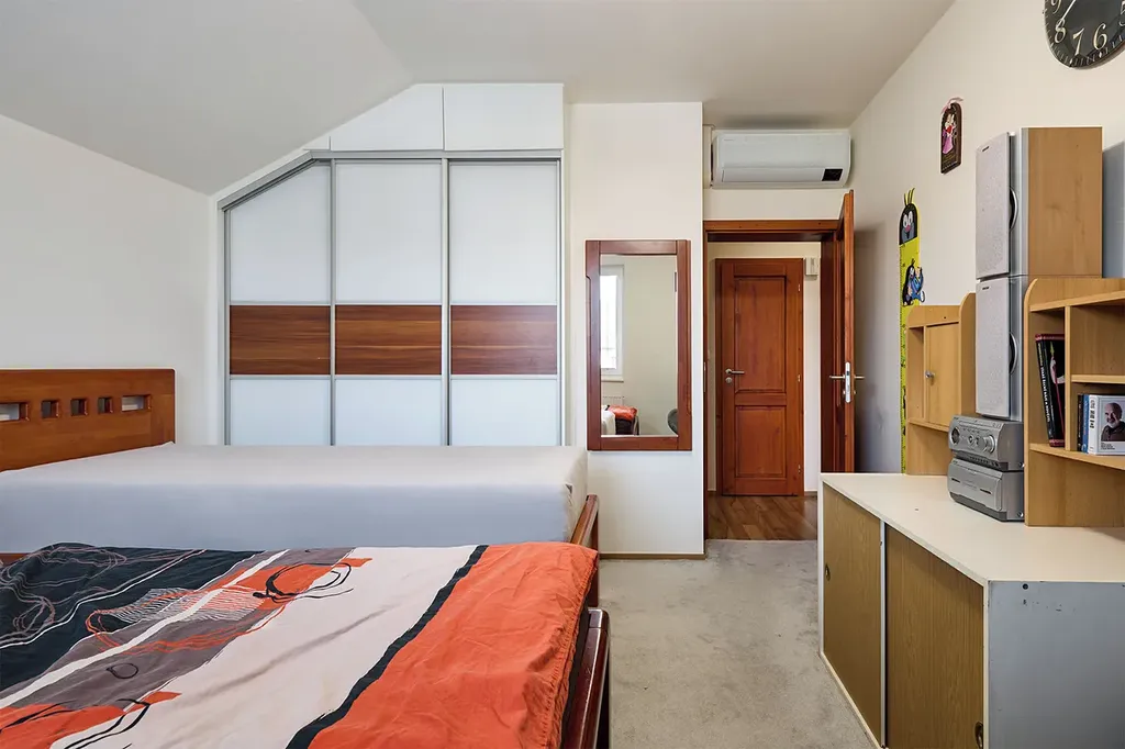 V horním patře je klid. Tři pokoje, koupelna s rohovou vanou a prostor, kde má každý své soukromí.