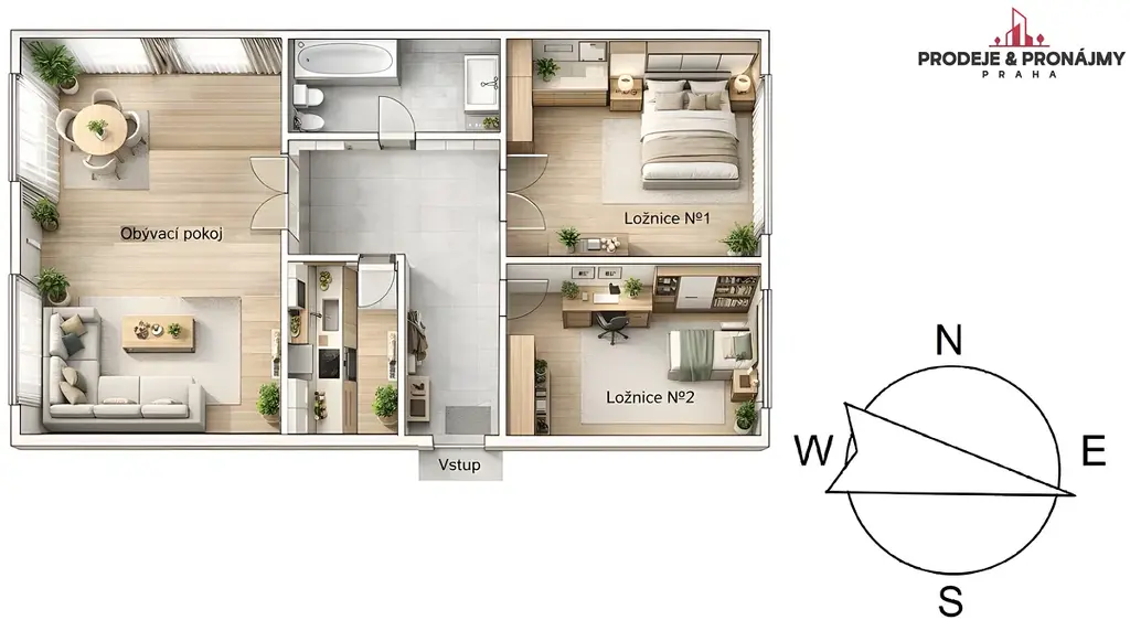 K dispozici jsou 3 samostatné pokoje s velkými okny. Jeden je směrem na severozápad do ulici ostatní na jihovýchod do vnitrobloku.