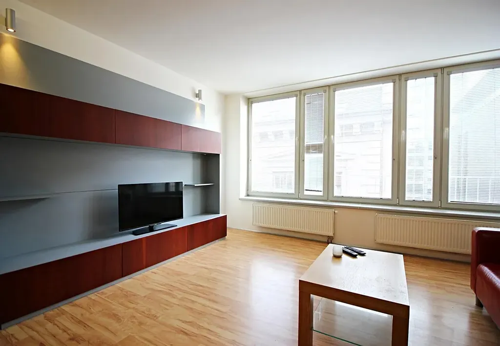 Obývací část bytu je zařízená skládací postelí, konferenčním stolkem a obývací stěnou s televizí.